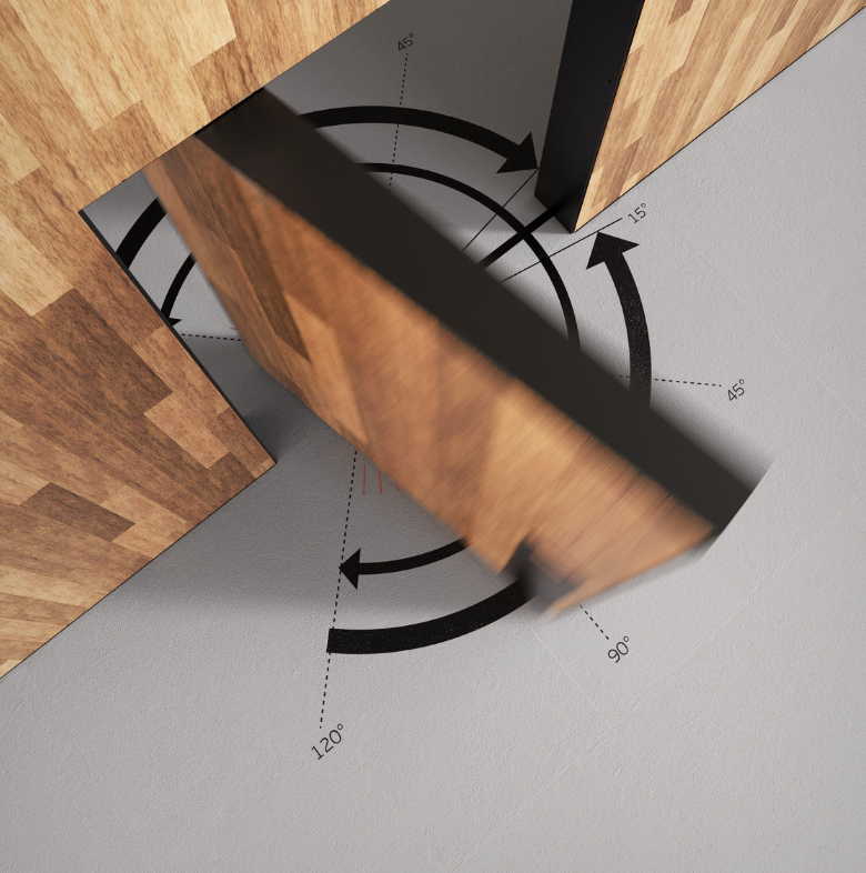 .-El sistema está oculto en el interior de la puerta, co n solo una pequeña base en el suelo, con regulación bidireccional y un punto de rotación en el techo o marco superior de la puerta con rodamiento incorporado.